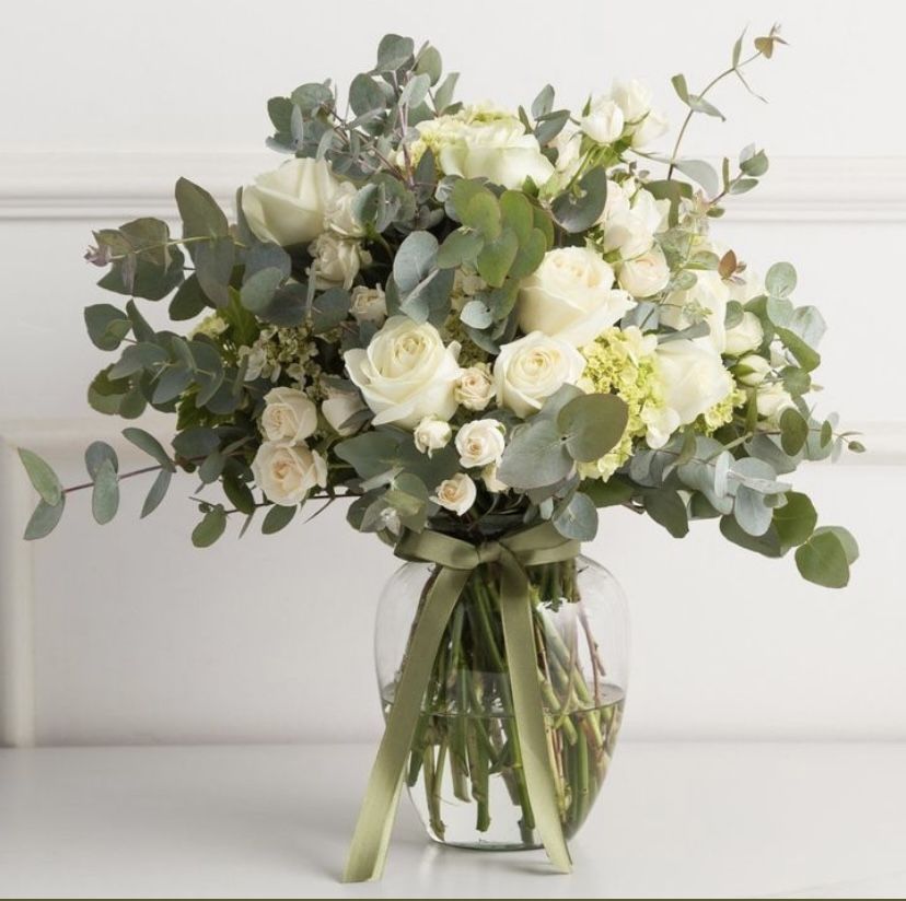 Faremos 2 entregas de 1 arranjo com vaso de vidro em tons de branco e verde. Clássico e sofisticado. As flores irão sempre no vaso, assim você não terá nenhum trabalho para arrumá-las.